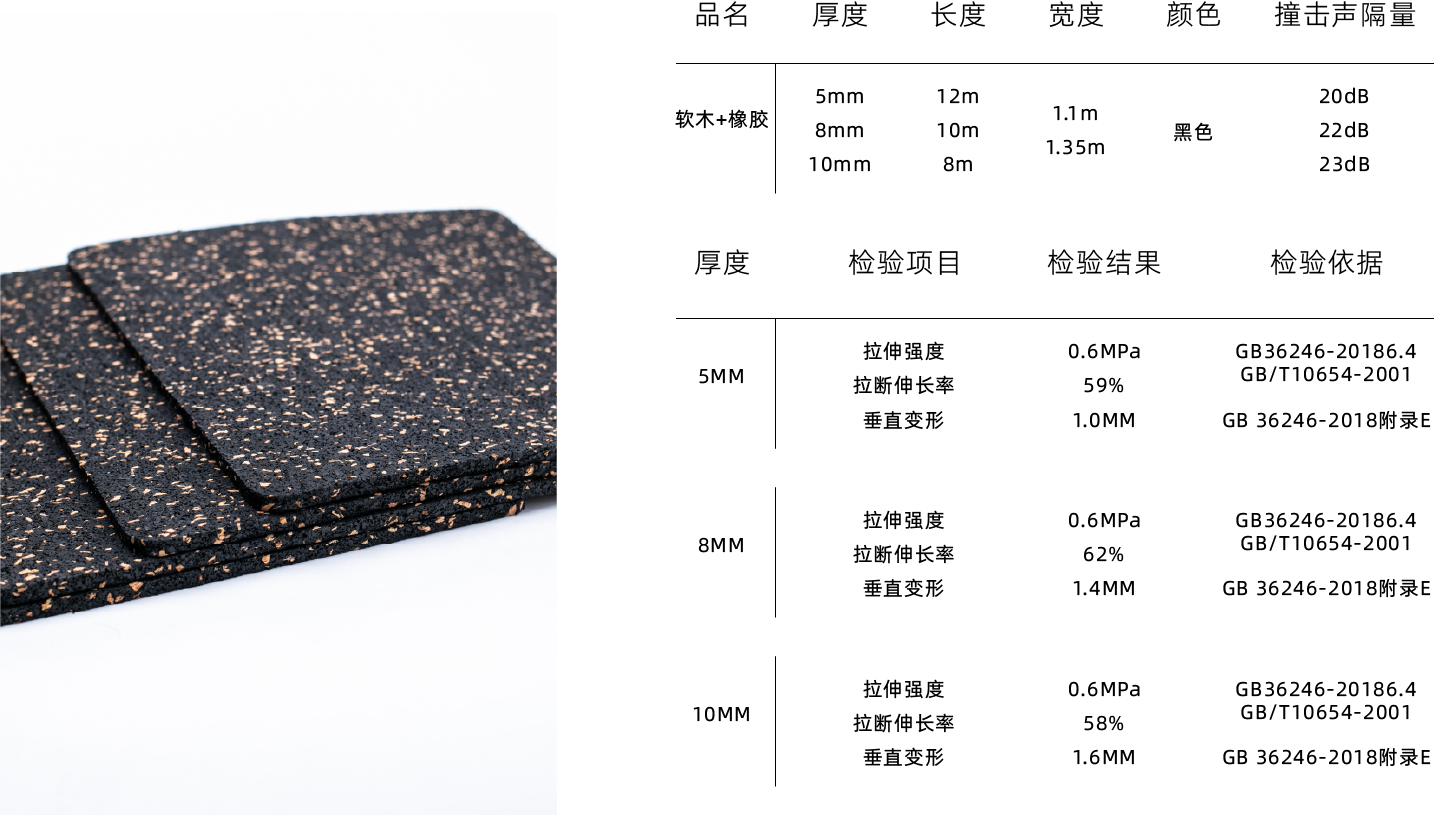 采用橡胶颗粒和聚氨酯粘合剂高温高压定型制作而成。在浮筑楼板构造中, 能有效的降低撞击噪声和空气传播噪声。